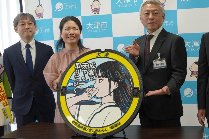 大津市膳所が舞台の人気小説「成瀬は天下を取りにいく」の特別デザインマンホールふたが1月19日、京阪膳所駅改札前に設置されました。
