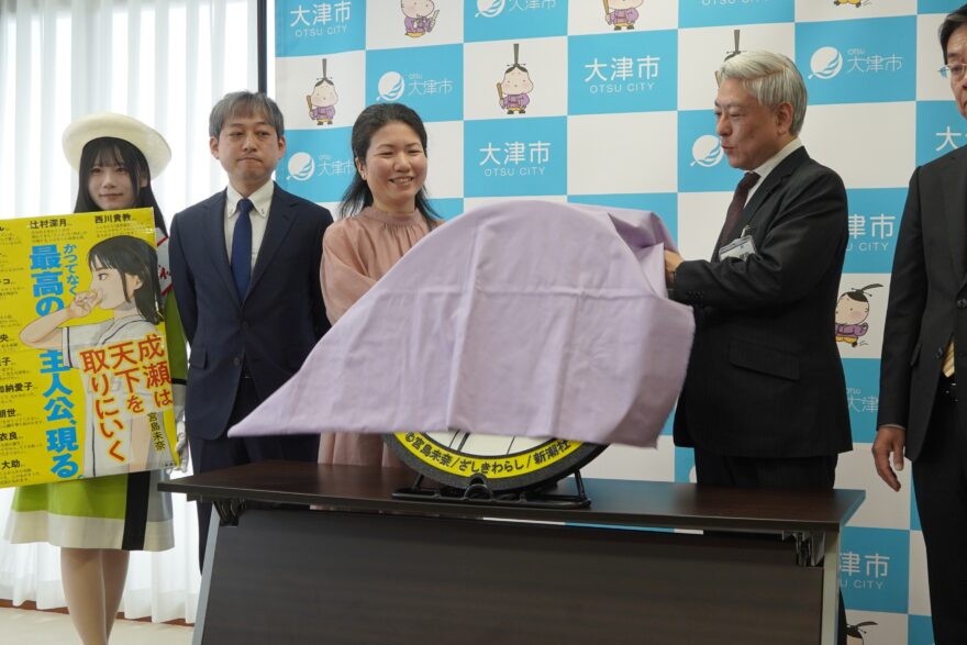 宮島さんは「デビューから約3年でここまで作品が育ったのは、大津の皆さんの支えがあったから」と感謝を述べ、「町の中に成瀬が刻まれるようでうれしい」と笑顔を見せました。デザインには文字色を白にするなど、宮島さんの意見も反映されています。
