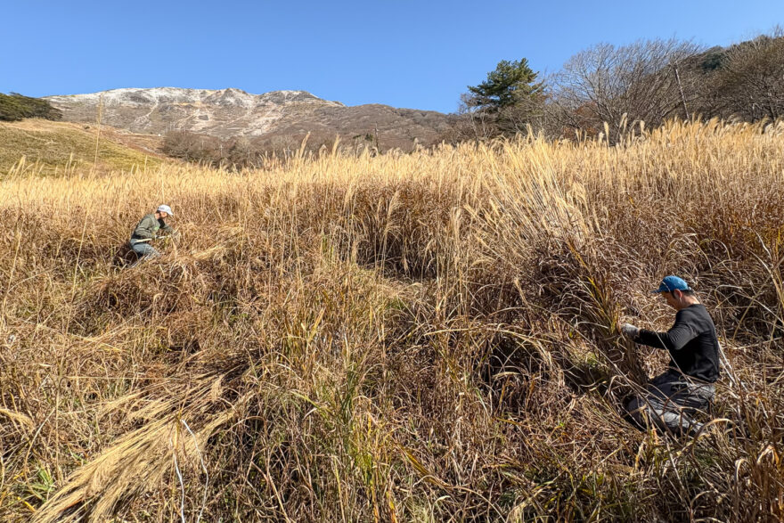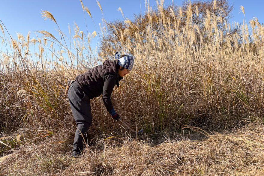 先ずはススキの刈り方の実演、2024年12月に登場いただいた茅葺き職人の大野沙織さんがざくざくとススキを刈り、束ねる手順を説明してくださいました。