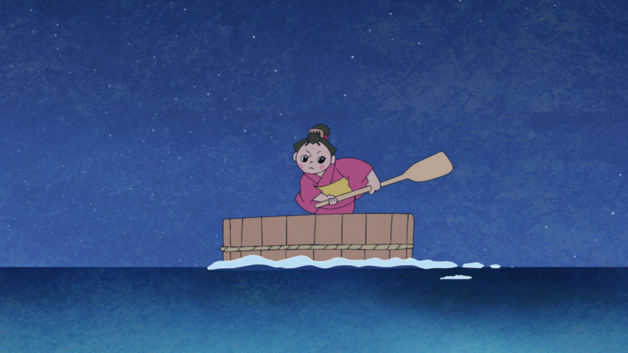 琵琶湖の草相撲で勝利した比良村の若者・八鉱山に、鏡村の娘おまんはひそかに心を寄せていました。勇気を出して想いを告げると、八鉱山は「百夜この湖を渡って通えば嫁にしよう」と告げます。おまんは今浜から小さなタライ舟で、嵐の夜も雪の夜も休まず湖を渡り続けました。九十九夜を越え、あと一夜で約束が叶うという夜、頼りの燈明は消えていました。闇に迷い、比良おろしに翻弄された舟は帰らず、おまんも湖に沈みました。百夜の恋はついに実らず、今も琵琶湖の風が、その切ない願いを運んでいると語られています。