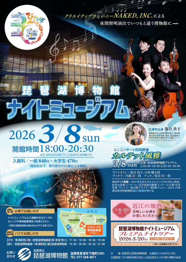 琵琶湖博物館では、令和8年(2026年)3月8日(日)にナイトミュージアム、20日(金・祝)にホテル宿泊付きのプレミアムナイトツアーを実施します。