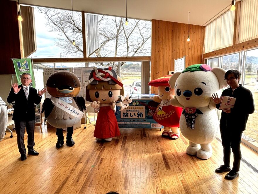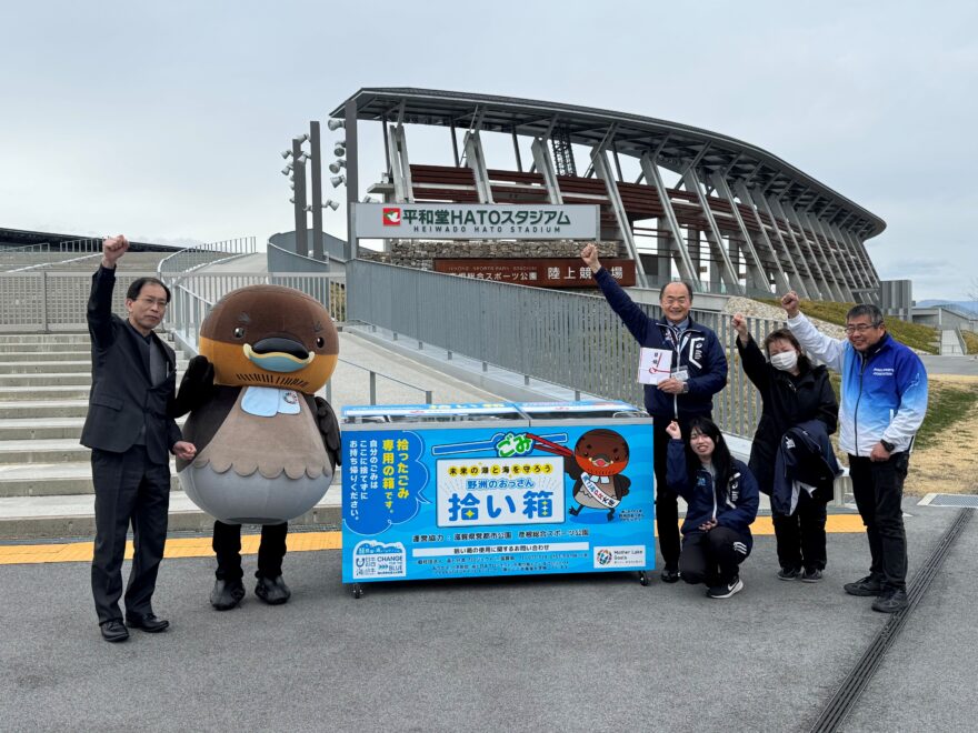 贈呈式には、滋賀県内で「海ごみPR大使」として、ごみ拾いをしながら琵琶湖一周を歩くキャラクター・野洲のおっさんカイツブリも参加しました。